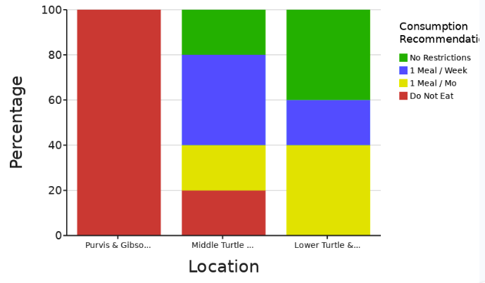 In the mid-1990s, after Glynn County sites were added to the Superfund list, the GDNR issued strict advisories for local seafood—often listed as “Do Not Eat.” The dataset you’ll explore shows how guidance for Brunswick has changed over time at three different locations as cleanup has progressed and time has passed. Your task is to look for patterns in the seafood-consumption recommendations for sites in the Turtle River Estuary and decide which parts of the story change as you filter the data in different ways.